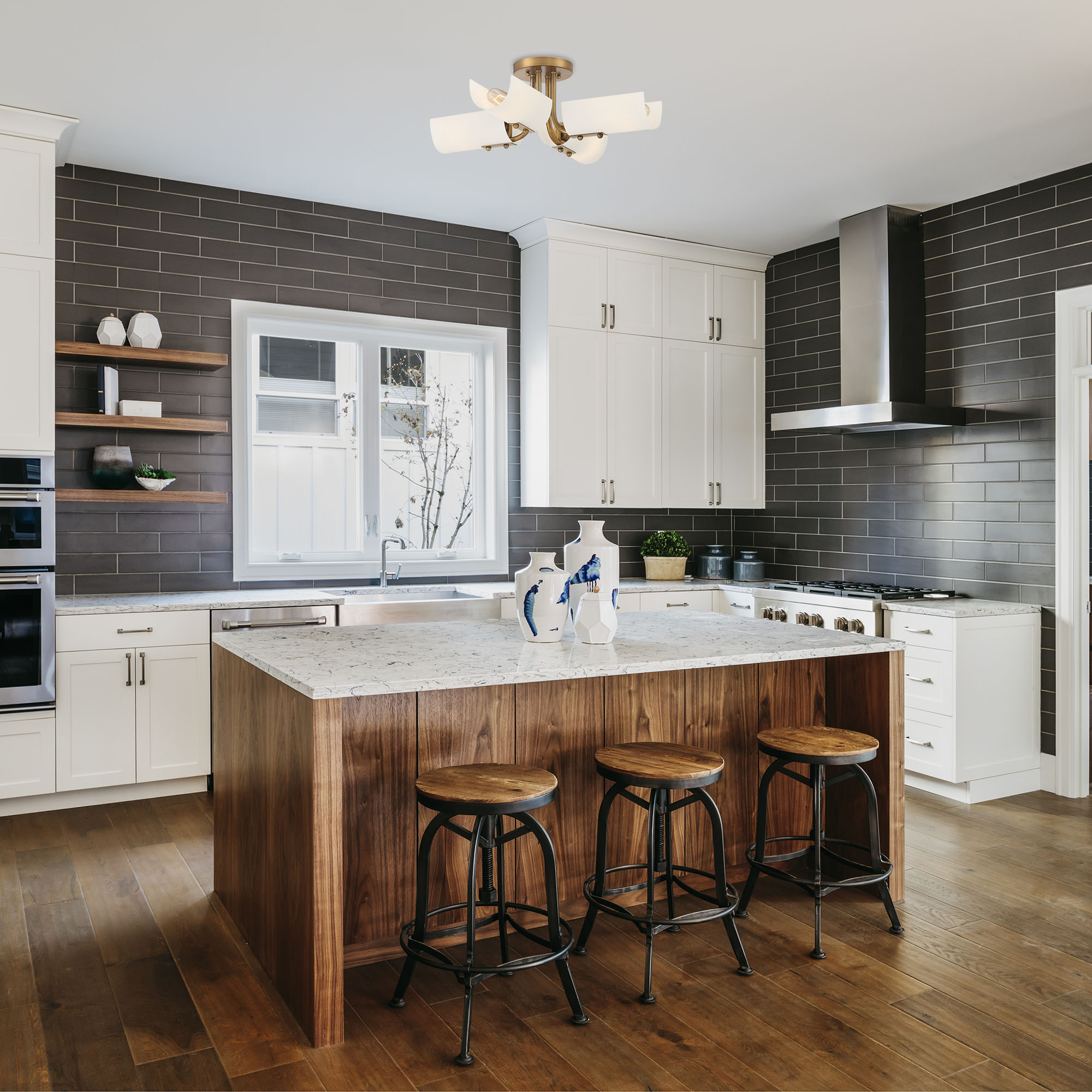• Etched white glass shades for soft, diffuse light